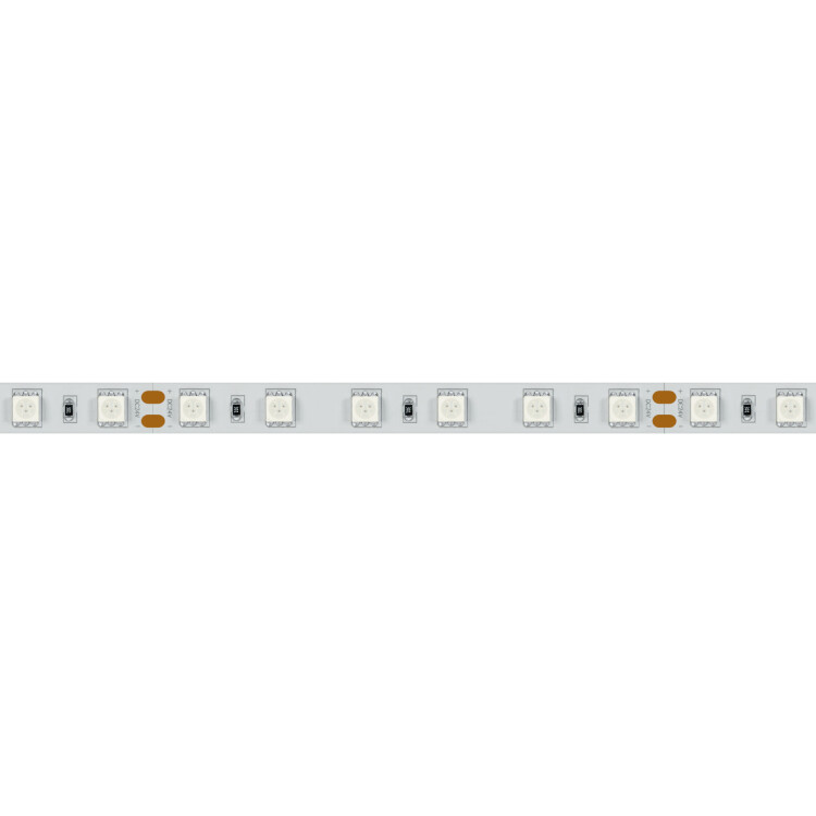 Мультицветная светодиодная лента RT серии B60. Светодиоды SMD 5060, 60 шт/м, белая плата шириной 10 мм, скотч 3M. Цвет RGB, угол 120°. Питание 24 В, мощность 14.4 Вт/м (72 Вт на 5 м). Размеры 5000x10x2.2 мм. Мин. отрезок 100 мм, 6 светодиодов. Цена за 1 м. Кратность заказа поставщику: 5 м.