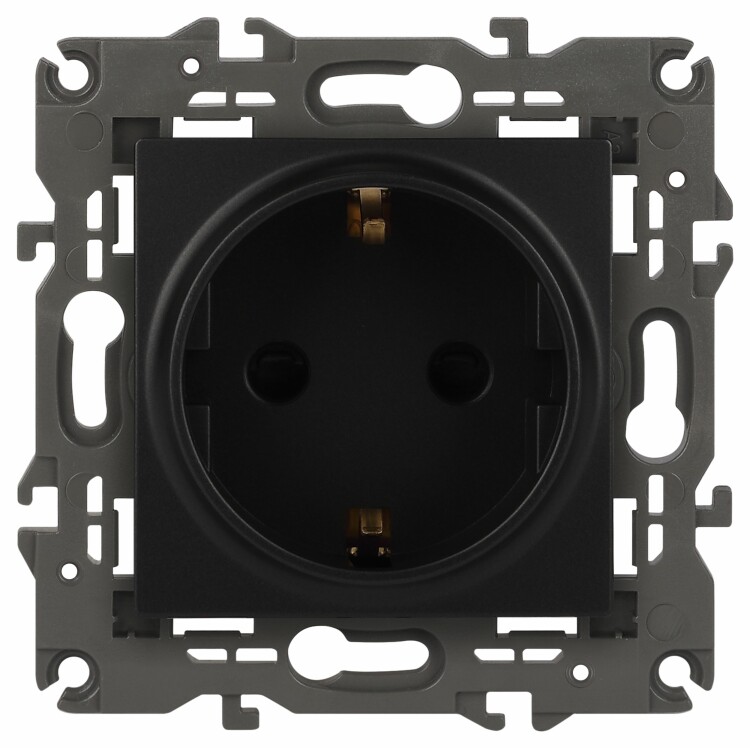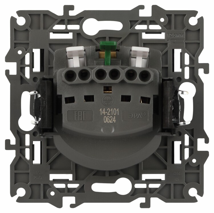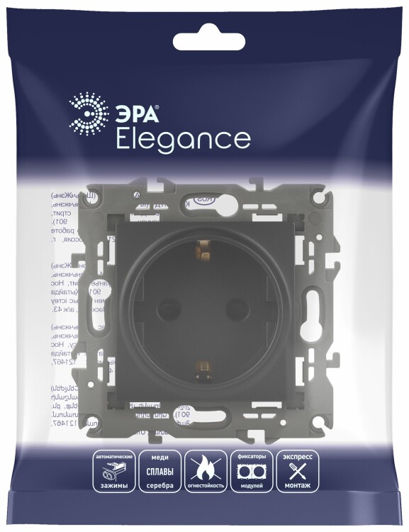 Розетка с заземлением Эра Elegance антрацит 14-2101-05. Оснащёна автоматическими клеммами для надёжной фиксации жил кабеля в механизме. Рамки приобретаются отдельно. Рамки Эра Elegance ПЛАСТИК: 1 пост 14-5001-хх, 2 поста 14-5002-хх, 3 поста 14-5003-хх, 4 поста 14-5004-хх, 5 постов 14-5005-хх; СТЕКЛО: 1 пост 14-5101-хх, 2 поста 14-5102-хх, 3 поста 14-5103-хх, 4 поста 14-5104-хх; МЕТАЛЛ: 1 пост 14-5201-хх, 2 поста 14-5202-хх, 3 поста 14-5203-хх, 4 поста 14-5204-хх; ДЕРЕВО: 1 пост 14-5301-хх, 2 поста 14-5302-хх, 3 поста 14-5303-хх, 4 поста 14-5304-хх (хх - код цвета: 00-прозрачный, 01-белый, белёный дуб, 02-слоновая кость, 03-алюминий, 04-шампань, 05-чёрный, чёрное дерево, 07-ясень, 09-дуб, 10-венге, 11-клён, 14-медь, 21-жёлтый, 22-оранжевый, 23-красный, 25-бордо, 26-лайм, 27-зелёный, 28-голубой, 29-синий, 30-розовый, 31-мокко, 32-серый, 41-сталь, 42-титан).