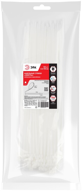 ЭРА Кабельная стяжка NO-225-151 (хомут) нейлоновая 3.6 х 150 мм белая (100 шт/уп)