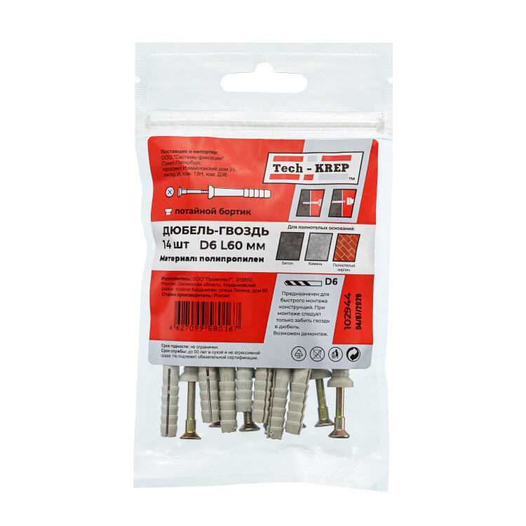 Tech-Krep Дюбель-гвоздь 6х60 пот. манжета (полипропилен) (14 шт) - пакет 102944