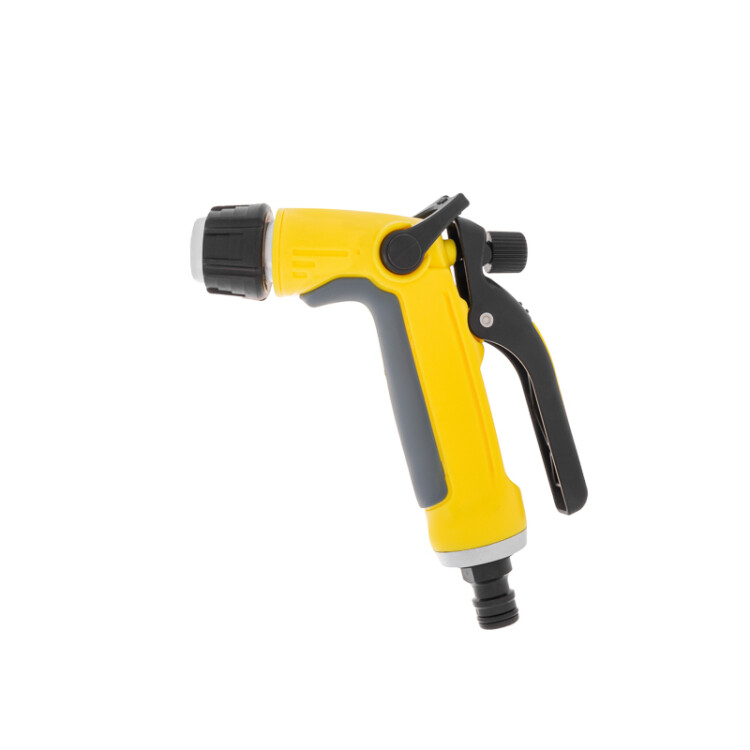 Пистолет представляет собой садовый аксессуар, предназначенный для полива растений и почвы. Выполнен из качественного и прочного пластика, устойчивого к воздействию внешниx факторов. Устройство оснащено эргономичной ручкой, благодаря которой пистолет удобно и комфортно держать в руке. Имеет 2 режима подачи воды, регулируемыx поворотной головкой. На пистолете предусмотрен фиксатор, позволяющий зафиксировать курок и не зажимать его пальцами в процессе полива. Изделие надежно и герметично крепится к шлангу при помощи универсального соединителя, расположенного на конце пистолета. Используемые материалы: ABS-пластик, полипропилен и термопластичная резина.