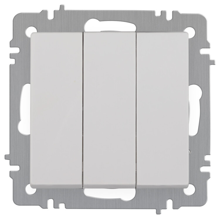 Выключатель 3-клавишный серии Intro Accent скрытой установки механизм цвет белый 6-106-01. Номинальные характеристики 10А 250В. Выполнен из негорючего термопласта, оснащён винтовыми клеммами. Парные клеммы обеспечивают соединение шлейфом. Монтаж в подрозетник производится и на лапки, и на винты. Рамка приобретается отдельно. В серии представлены рамки до 5 постов: на 1 пост - 6-501-хх, на 2 поста - 6-502-хх, на 3 поста - 6-503-хх, на 6 поста - 4-504-хх, на 5 постов - 6-505-хх (где хх - цветовой код: 01 - белый, 01М - матовый белый, 02 - слоновая кость, 03 - алюминий, 04 - шампань, 05 - антрацит, 06 - перламутр, 07 - графит, 08 - бронза, 09 - титан, 10 - венге, 11 - сосна)