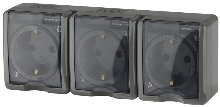 Розетка тройная IP54 3-я серии Эра Эксперт откр ытой установки цвет серый 11-2405-03. Номинальные характеристики 16А 250В . Устройство выполнено из качественного поликарбоната, оснащёно уникальными винтовыми клеммами ЭКСПЕРТ для максимально качественного зажима кабеля в механизме.