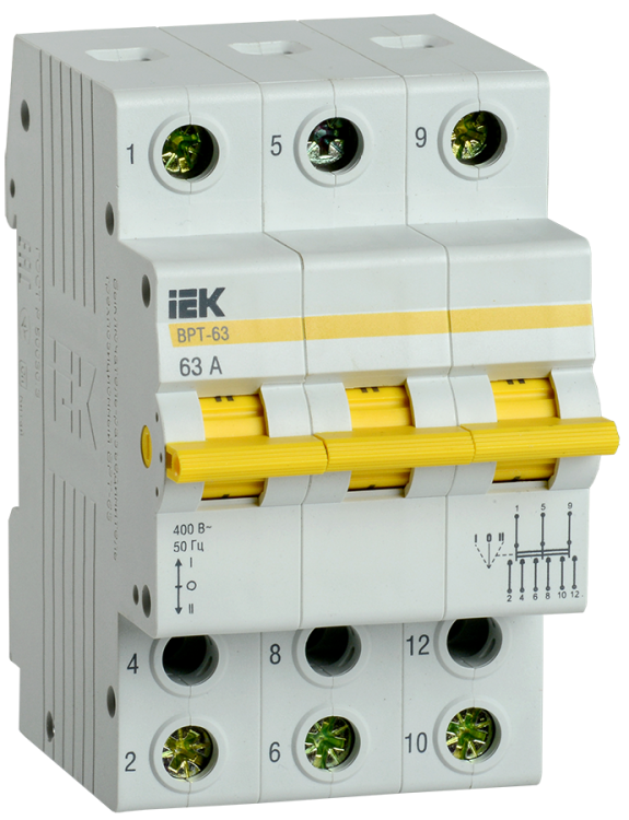 Выключатель-разъединитель трехпозиционный ВРТ-63 предназначен для коммутации смешанных активных и индуктивных нагрузок в цепях переменного тока напряжением до 400 В частотой 50 Гц. Применяется в качестве учетно-распределительного оборудования жилых и общественных зданий и сооружений, где предусматривается необходимость в оперативном отключении от сети отдельных групп электропотребителей или участков электрокоммуникации.