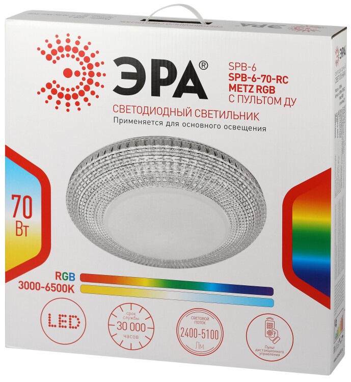Светильник светодиодный потолочный ЭРА SPB-6-70-RC серии Metz RGB отличается возможностью регулирования яркости светового потока и цветовой температуры. Пульт дистанционного управления имеет крупные кнопки с подсказками, очень удобен в использовании. Светильник можно расположить в уютной гостиной и менять яркость освещения в зависимости от настроения или необходимости. Цветовая температура регулируется в пределах от 4000 К до 6000 К. Диаметр корпуса составляет 50 см. Рассеиватель выполнен в виде сочетания белой матовой части и боковых сторон "под хрусталь" - изящно и утонченно. На стальном корпусе основания располагается светодиодная плата, оснащенная современным и надежным драйвером. Модель снабжена функцией RGB, позволяющую увидеть привычные вещи в необычных цветовых решениях.