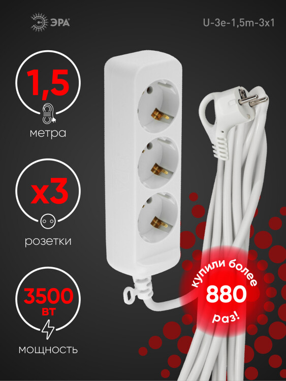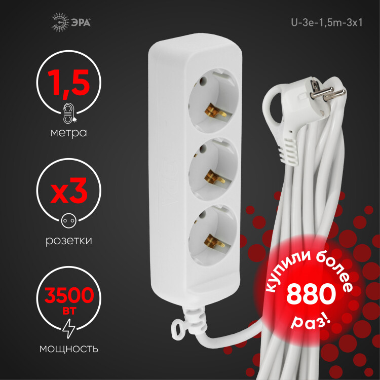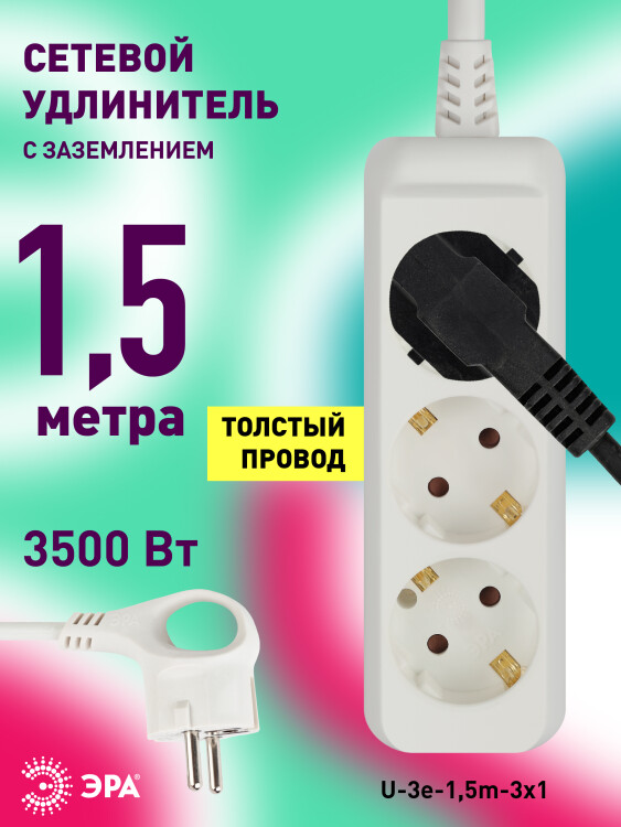 Удлинитель электрический Эра U-3e-1,5m с заземлением, ПВС, 3x1мм2, 3 розетки, 1,5м. Рассчитан на максимальную мощность 16А/3500 Вт. Удлинитель Эра станет Вашим надежным помощником, если Ваши любимые электроприборы находятся далеко от розеток. Провод в удлинителях Эра сделан из 100% меди, что делает его абсолютно пожаробезопасным. Корпус выполнен из ударопрочного и негорючего пластика (полипропилен). В моделях с заземлением у вилки есть кольцо для удобного извлечения из розетки. Модель удлинителя на 16А позволяет подключить мощные бытовые приборы общей нагрузкой до 3500Вт. Не бойтесь включить чайник, обогреватель, микроволновку или другие электроприборы. Толстый провод удлинителя Эра гарантирует полную безопасность. Дизайн удлинителя разработан в России командой Эра Style.