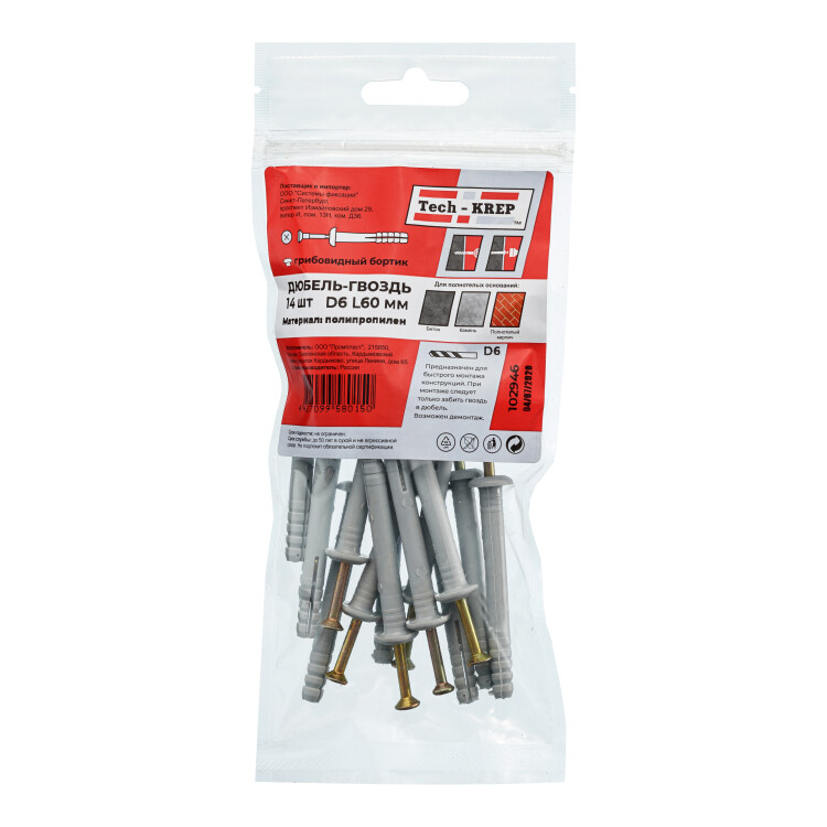 Особенности: для установки необходимо предварительно просверлить отверстие. Прочность крепежа достигается расклиниванием дюбеля в отверстии гвоздем в момент удара молотком. С помощью крестообразного шлица на головке гвоздя можно легко ослабить или усилить крепеж, демонтировать его.