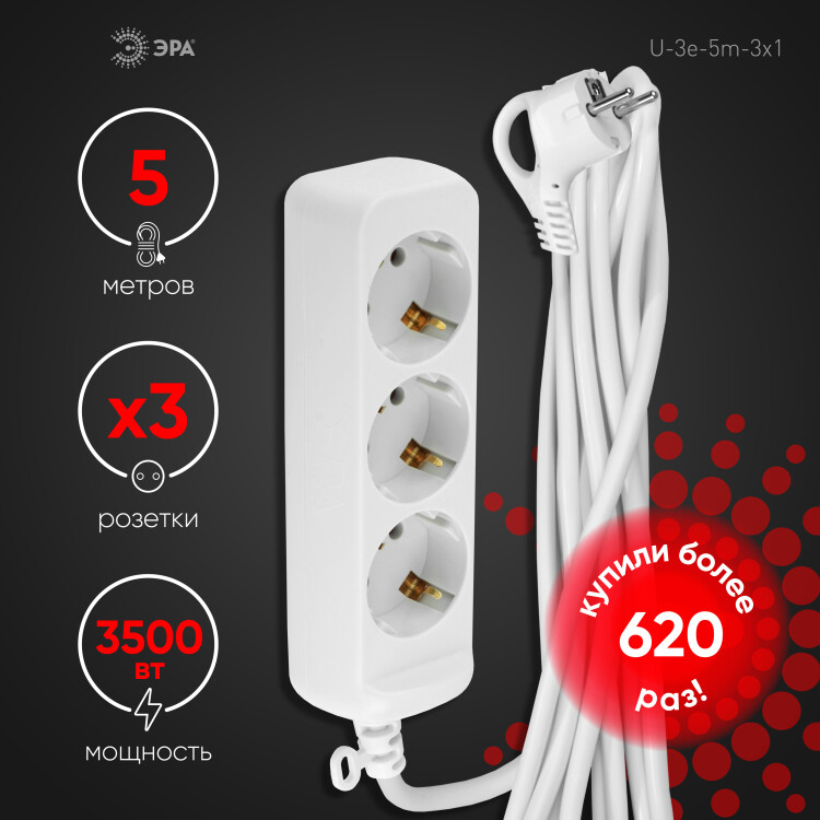 Удлинитель электрический Эра U-3e-5m с заземлением, ПВС, 3x1мм2, 3 розетки, 5м. Рассчитан на максимальную мощность 16А/3500 Вт. Удлинитель Эра станет Вашим надежным помощником, если Ваши любимые электроприборы находятся далеко от розеток. Провод в удлинителях Эра сделан из 100% меди, что делает его абсолютно пожаробезопасным. Корпус выполнен из ударопрочного и негорючего пластика (полипропилен). В моделях с заземлением у вилки есть кольцо для удобного извлечения из розетки. Модель удлинителя на 16А позволяет подключить мощные бытовые приборы общей нагрузкой до 3500Вт. Не бойтесь включить чайник, обогреватель, микроволновку или другие электроприборы. Толстый провод удлинителя Эра гарантирует полную безопасность. Дизайн удлинителя разработан в России командой Эра Style.