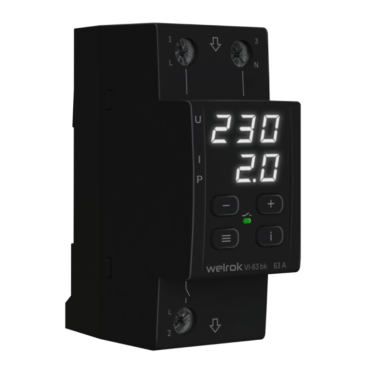 Реле напряжения с контролем тока Welrok VI bk защищает оборудование от скачков и провалов напряжения, последствий обрыва нулевого провода и превышения тока или мощности. Реле отключает нагрузку, если напряжение, ток или мощность выходит за установленные пределы и автоматически включает нагрузку, когда значение параметра вернется в норму.
