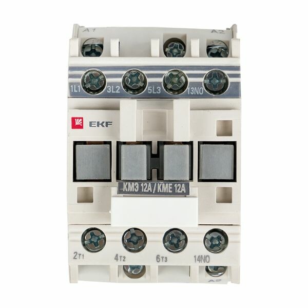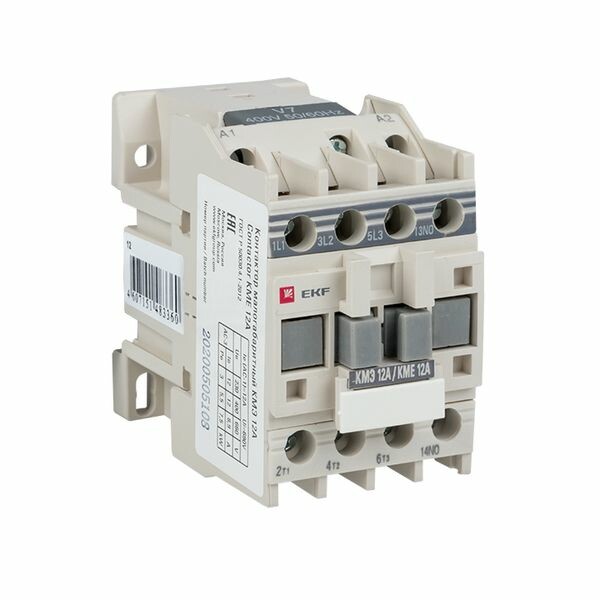 Контакторы КМЭ EKF PROxima состоят из корпуса, закрепленных в нем неподвижных контактов, подвижных контактов, которые закреплены в подвижной части магнитной системы. Неподвижная часть магнитной системы закреплена жестко в корпусе КМЭ. Пружина препятствует смыканию контактов. При подаче напряжения на катушку управления в магнитной системе контактора возникает магнитное поле, которое, преодолевая сопротивление пружины, смыкает магнитную систему и замыкает контакты. При отключении напряжения с катушки управления пружина размыкает контакты. Возможна коммутация алюминиевым и медным проводом.