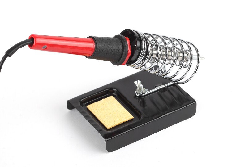 Подставка под паяльник Применяется для хранения паяльника вовремя его нагрева и в перерывах между работой.Паяльник легко и удобно умещается в направляющую закреплённую на устойчивой штампованной платформе с ложементом под губку. Губка для очистки жала от припоя идёт в комплекте.