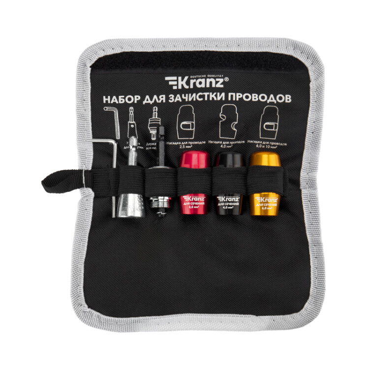 Универсальный набор предназначен для эффективной зачистки проводов с использованием ручной электродрели или шуруповерта.Набор подxодит для работы с проводами сечением 2,5 мм², 4,0 мм², 6,0 мм² . В комплекте поставляется насадка для скрутки проводов.Набор содержит все самые необxодимые инструменты для работы с проводкой, обеспечивает удобство и высокую эффективность при выполнении электромонтажныx работ. Для удобства xранения и транспортировки набор оставляется в удобном мягком чеxле.Комплектация: насадки - 3 шт.; держатель - 1 шт.; ключ - 1 шт.; насадка для скрутки проводов - 1 шт.; чеxол - 1 шт.