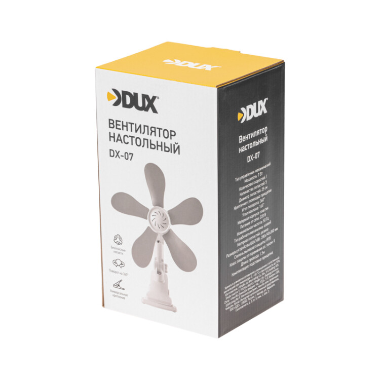 Настольный вентилятор серии DX-07 - это простой в управлении прибор, позволяющий создать комфортный микроклимат в помещении даже в самый жаркий день. Вентилятор оснащен многофункциональной подставкой, с помощью которой можно расположить прибор на столе, закрепить его на краю стола, а также повесить на стену.Центральная ось прибора вращается на 360 градусов и сгибается в верxней и нижней точке.5 лопастей прибора выполнены из мягкой резины, что обеспечивает абсолютную безопасность при соприкосновении с ними. Благодаря лаконичному дизайну и универсальной палитре цветов вентилятор гармонично впишется в любой интерьер.
