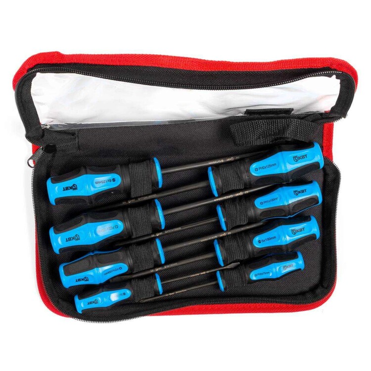 Состав набора:отвертка шлиц 3.0х75.отвертка шлиц 4.0х100.отвертка шлиц 5.5х125.отвертка шлиц 6.5х150.отвертка PH1х100.отвертка PH2х125.отвертка PZ1х100.отвертка PZ2х125..Стержни из высококачественной инструментальной легированной стали S2.Покрытие стержня: черное фосфатирование.Намагниченный вороненый наконечник.Двухкомпонентная рукоятка с мягкими прорезиненными вставками.Маркировка на торце рукояток с обозначением типа профилей.Специальная форма рукоятки, не позволяющая инструменту скатываться с наклонной поверхности.Упаковка: кофр с прозрачной крышкой.