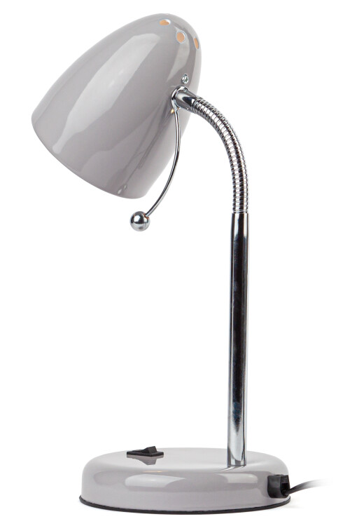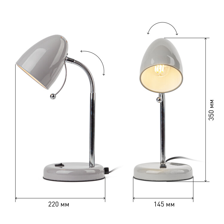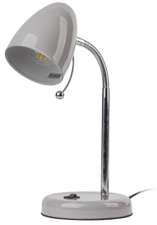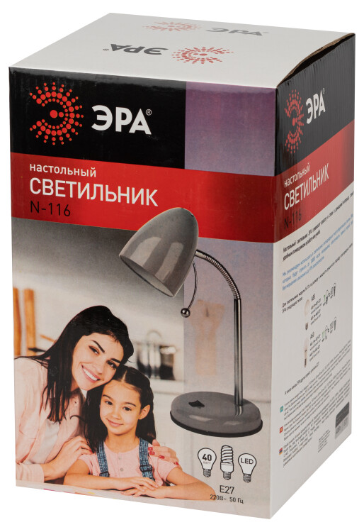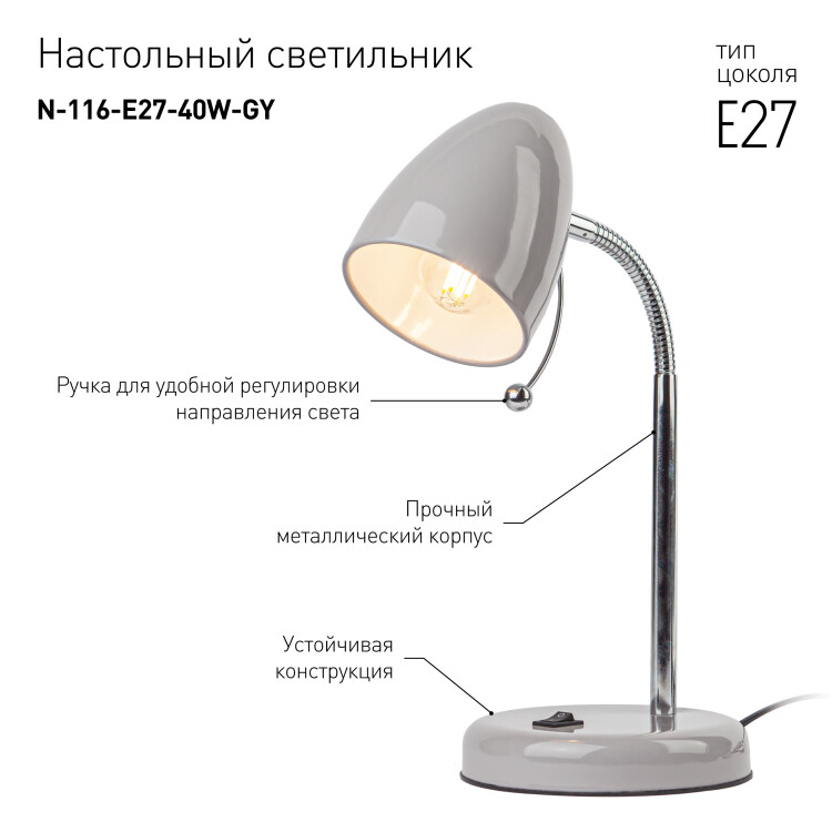 Настольный светильник ЭРА N-116-Е27-40W-GY с цоколем Е27 компактного размера для удобного размещения на столе. Может использоваться с лампой накаливания, компактной люминесцентной лампой (КЛЛ) или светодиодной (LED) лампой. У светильника металлические стойка и плафон, выключатель на основании. Высота расположения плафона регулируется сгибающейся стойкой, направление света - наклоном и поворотом плафона в любом направлении.