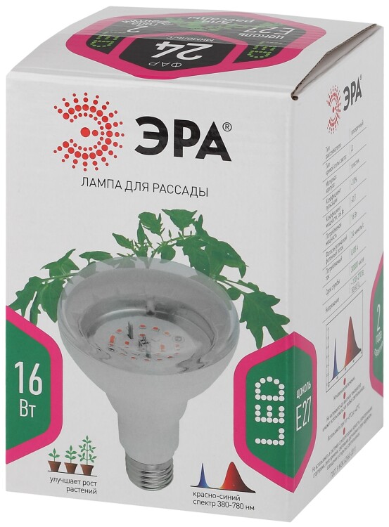 Лампа ЭРА FITO-16W-RB-E27-K поможет Вам не только создать прекрасный зеленый уголок, но и вырастить спелый урожай. Рекомендуем размещать фитосветильник на расстоянии до 35 см от верхушек растений.Благодаря красно-синему спектру активизируется процесс фотосинтеза, укрепляется корневая система. Ростки быстро взойдут и порадуют Вас зелеными листочками. Кроме того, прозрачный плоский рассеиватель увеличивает эффективность использования почти вдвое. Площадь освещения около полуметра.Вам будет приятно находиться рядом с лампой, ведь ее светло-розовый оттенок свечения с отсутствием пульсаций не будет раздражать глаза.Отделка корпуса алюминием не нагревается и обладает высокой прочностью.Фитосветильник подойдет как для взрослых растений, так и для рассады. Возможна эксплуатация даже при отсутствии естественных источников излучения. Идеален для выращивания зелени, и пасленовых: помидоров, перцев, баклажанов. Для выращивания огурцов необходимо добавить источник света со спектром с максимумом в зеленом свете.Порадуйте себя и зеленых обитателей Вашего дома светодиодной лампой ЭРА.