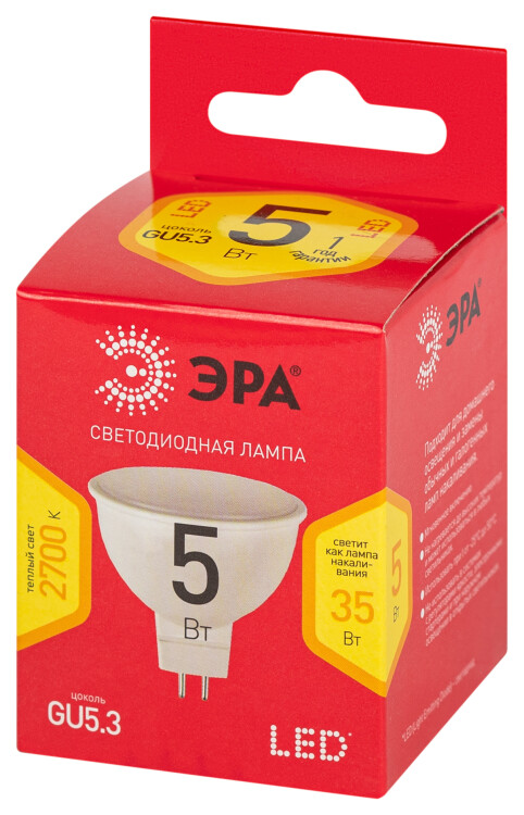 ЭРА Лампа светодиодная RED LINE LED MR16-5W-827-GU5.3 R 5Вт софит теплый белый свет GU5.3