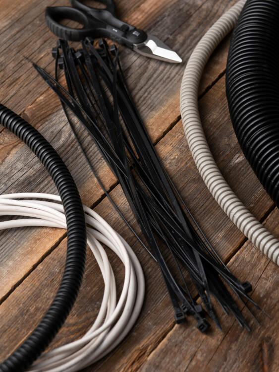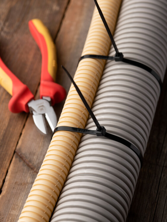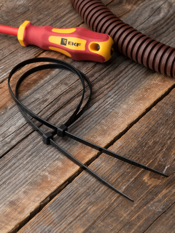Предназначен для увязки кабелей и проводов в пучок и монтажа кабельных линий и проводников. Ремешок самофиксирующийся, блокирующий механизм. Изготовлен из Nylon 6.6, устойчивого к старению, коррозии, воздействию солей, ультрафиолета, кислот, щелочей, спирта, бензина и масел. При производстве кабельных стяжек черного цвета добавляется угольный порошок, который является одним из наиболее эффективных стабилизаторов. Он улучшает физические свойства продукции в стойкости к погодным условиям и УФ-излучению (прямые солнечные лучи).