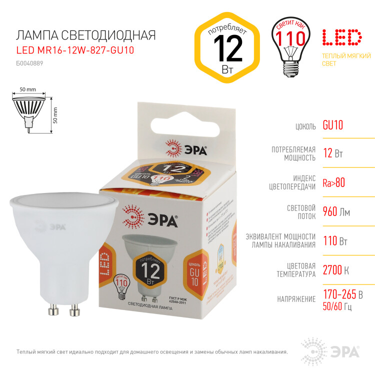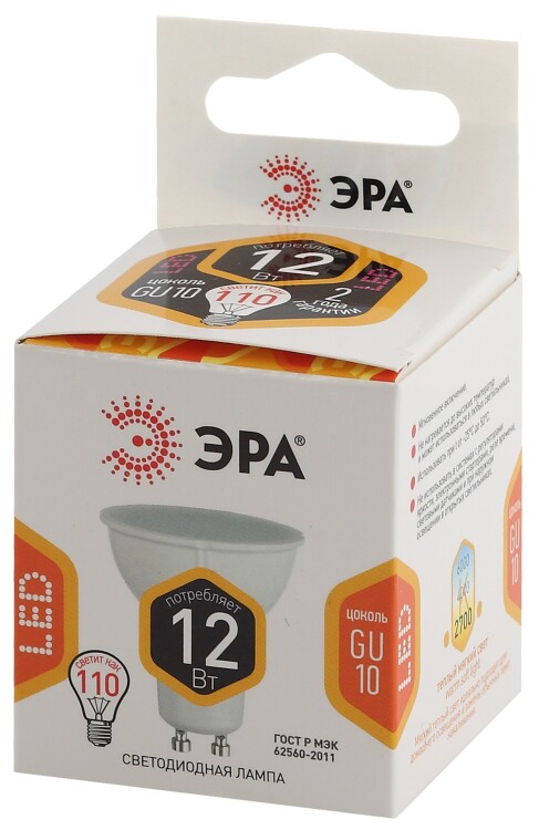 ЭРА Лампа светодиодная STD LED MR16-12W-827-GU10 12Вт софит теплый белый свет GU10