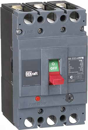 Автоматический выключатель серии ВА-332 DEKraft; 3P; номинальный ток 63 А, отключающая способность Icu = 50 кА (при 415 В 50 Гц); расцепитель and ndash; термомагнитный, регулируемый. В комплект поставки входят 4 межфазные перегородки и крепеж на монтажной плате. В дополнение к выключателям выпускается ряд аксессуаров, расширяющих их функционал: сигнальные контакты, расцепители напряжения, моторные приводы, шины выносные и др.