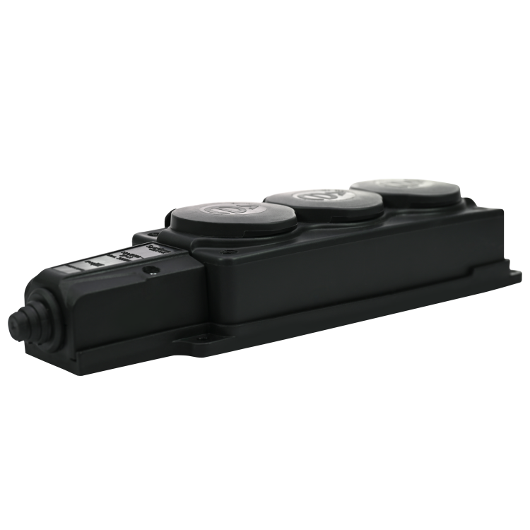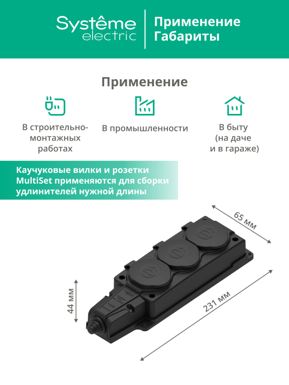 Колодка каучуковая MultiSet (Systeme Electric) на 3 поста (2К+З) 16А/250В. Предназначена для сборки удлинителей нужной длины. Обладает повышенной прочностью и степенью пылевлагозащиты IP44. Имеет 4 отверстия для крепления на поверхность и ещё одно для подвешивания. Температурный диапазон эксплуатации – от -30 до +45 °С.