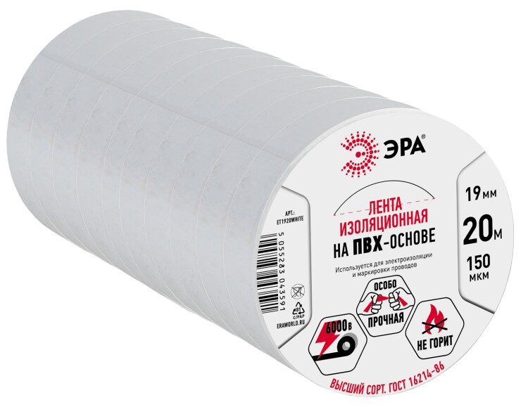 ЭРА Изолента ET1920WHITE ПВХ 19мм х 20м белая