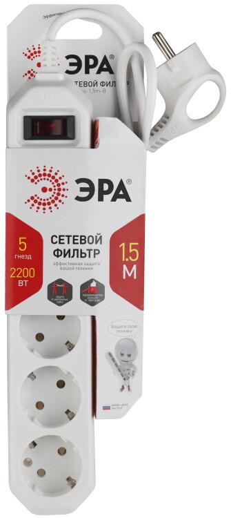 Сетевой фильтр ЭРА USF-5es-1.5m-W обладает несомненными достоинствами, позволяющими ему стать необходимым атрибутом современного дома. Прочный корпус универсального цвета имеет 5 розеток, каждая из которых имеет заземление. Длина его провода составляет 1.5 м, что особенно удобно в пределах одной комнаты. Функционируя как удлинитель, сетевой фильтр ЭРА исключит большое количество лишних проводов. Он защищает от перегрузки сети, короткого замыкания, фильтрует импульсные помехи. При этом мощность фильтра составляет 2200 Вт, что обеспечивает безопасную и стабильную работу техники. Современная квартира уже не представляется без большого количества приборов, и именно сетевой фильтр защитит их в любой ситуации. Сетевые фильтры разрабатываются собственным техническим бюро, проходят проверку на всех этапах производства, что обеспечивает высокое качество продукта.