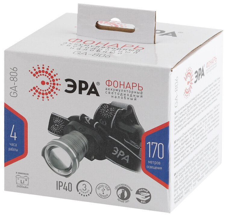 ЭРА GA-806 налобный фонарь с емким литиевым аккумулятором 2,5 мАч, яркими экономичными светодиодами CREE и регулируемым фокусом. Корпус из ударопрочного пластика защищает устройство от поломок при падениях и ударах. Фонарь станет отличным помощником в путешествиях или работе в экстремальных условиях. Удобен в использовании в быту. Мягкий эластичный ремешок с регулировкой размера надежно фиксирует устройство на голове, при этом не натирая кожу. Выдвигаемая линза обрамлена надежным стальным кольцом. Можно выбирать нужный тип света от дальнего направленного луча до заливающего ближнего освещения. Заряжается от USB. Тип упаковки и комплектация: картонная упаковка, micro-USB зарядка, аккумуляторы, инструкция в комплекте.
