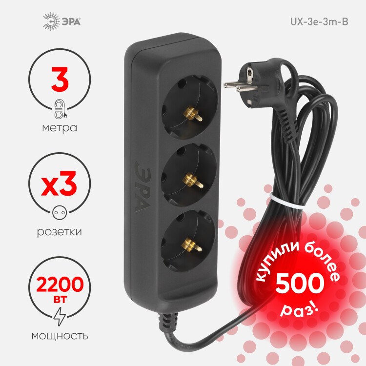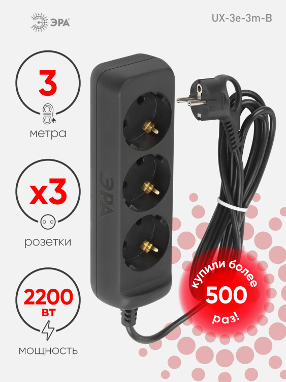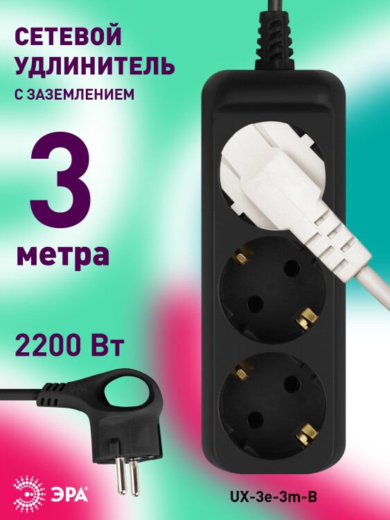 Удлинитель электрический Эра UX-3e-3m-B с заземл ением, черный, 3 розетки. Провод ПВС, 3x0,75мм2, 3 м. Рассчитан на максимальную мощность 10А/2200 Вт. Удлинитель Эра станет Вашим надежным помощником, если Ваши любимые электроприборы находятся далеко от розеток. Провод в удлинителях Эра сделан из 100% меди, что делает его абсолютно пожаробезопасным. Корпус выполнен из ударопрочного и негорючего пластика (полипропилен). Вилка обеспечена кольцом для удобного извлечения ее из розетки. Модель удлинителя на 10А позволяет подключить бытовые приборы общей нагрузкой до 2200Вт. Дизайн удлинителя разработан в России командой Эра Style.