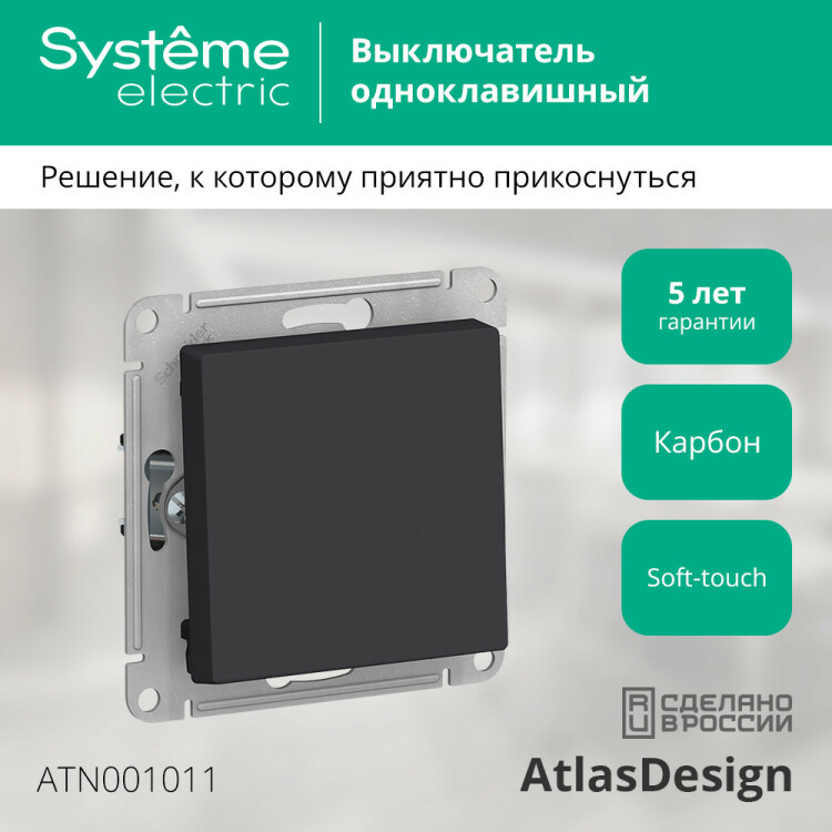 Механизм Systeme Electric (ранее Schneider Electric) серии AtlasDesign в цвете карбон выключателя 1-клавишного подходит для сетей 250 В, на ток 10 А. Лицевые детали из качественного ABS-пластика, устойчивого к царапинам и УФ-излучению. Благодаря покрытию «soft touch» к изделию приятно прикасаться. Усиленные прямые монтажные лапки для лучшей фиксации механизма в монтажной коробке.