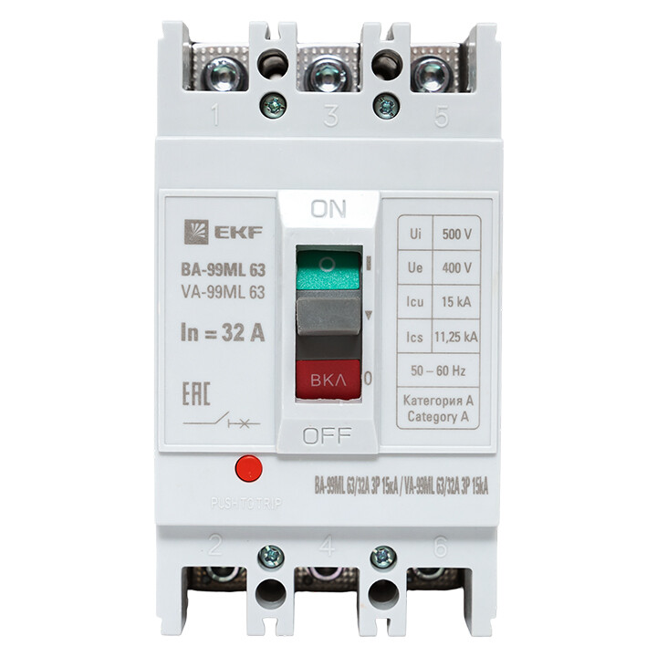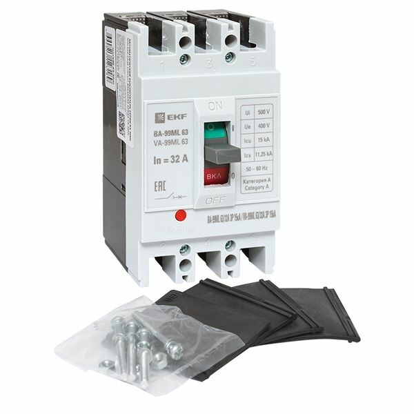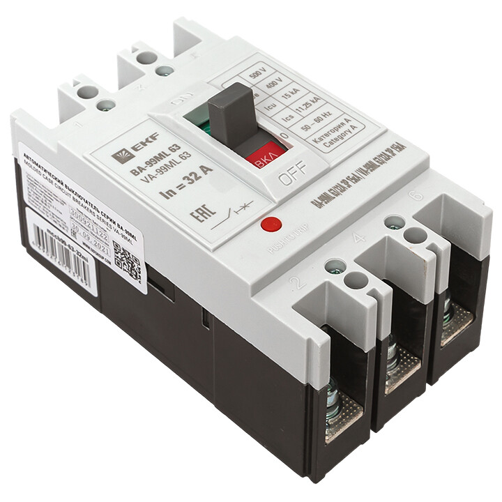 Выключатель ВА-99 выполнен в виде моноблока и состоит из основания и крышки с фальшпанелью, в которой имеется окно для рукоятки управления и толкатель кнопки «Тест» - проверки механизма отключения выключателя. Основание выполнено из термостойкой пластмассы, не поддерживающей горение и являющейся несущей конструкцией для присоединительных зажимов, неподвижных и подвижных контактов с системой дугогашения, механизма управления, блока защиты от сверхтоков. Крышка закрывает все подвижные элементы механизма управления и внутренние токоведущие части.
