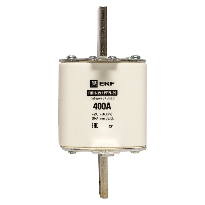 Плавкая вставка ППН-39 630/400А габарит 3 EKF. Предохранители плавкие ППН EKF, укомплектованные плавкими вставками типа gG/gL, предназначаются для защиты кабельных линий и промышленных электроустановок от токов перегрузки и короткого замыкания. Предохранители применяются в электрических сетях переменного тока частотой 50 Гц с напряжением до 660В. Применяются для крепления в распределительных и вводно-распределительных устройствах. Предохранители плавкие ППН могут устанавливаться в основание с держателем, а также в специально предназначенные рубильники. В комплект поставки предохранителей плавких ППН основание с держателем не входит и приобретается отдельно.