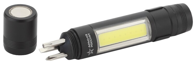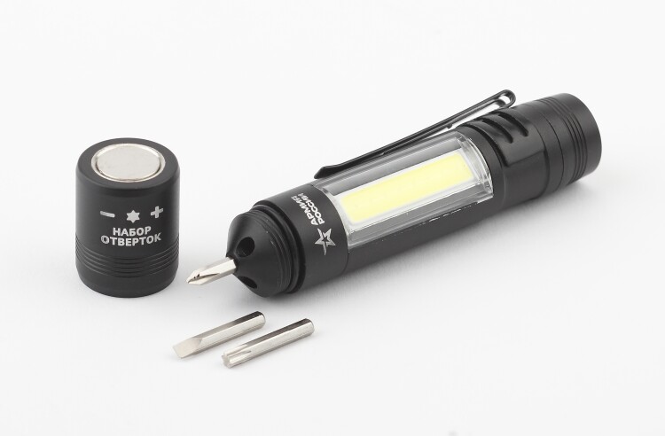 ЭРА Армия России Сапёр - фонарь со встроенным набором инструментов: плоская, крестовая отвёртки и торкс. Легко крепится к самым разным поверхностям при помощи магнита и клипсы на корпусе. LED-плата с широким ярким светом.Инструменты встроены в корпус фонаря и спрятаны под аккуратной крышкой. На внешней стороне крышки расположен магнит - освещение можно закрепить на любой металлической поверхности. LED-плата в виде вытянутого прямоугольника расположена практически по всей длине устройства и даёт яркий заливающий свет. В совокупности с магнитным креплением эта опция - отличная возможность применять фонарь в качестве походного светильника. Ещё один доступный тип крепления - клипса для ремня: фонарь всегда с собой, при этом карманы и руки свободны. Дальность луча - 13 метров. Использованы премиум-светодиоды СОВ ("мультикристалл на плате" - адаптированный для бытовых целей промышленный свет) - сверхъяркие и суперэкономичные. ЭРА Армия России Сапёр питается от одной пальчиковой батарейки, заряда хватает на 17 часов. Данный фонарь - часть совместной серии с АО "Военторг" (действующим на основе лицензии Министерства обороны РФ). Фирменный логотип с узнаваемой звездой расположен на корпусе изделия.