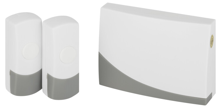 Беспроводной электрический дверной звонок с двумя кнопками, защищёнными от влаги и пыли. Отличное решение для дачи или загородного дома, когда на территорию есть разные входы. Для каждой кнопки своя полифоническая мелодия. Звонок работает от батареек: 1 шт А23 для кнопки (входит в комплект), 2 шт АА пальчиковые для динамика (в комплект не входят). Аккуратный бело-серый дизайн актуален для любого интерьера. Приятная упаковка делает данный звонок хорошим подарком на новоселье и другие праздники.