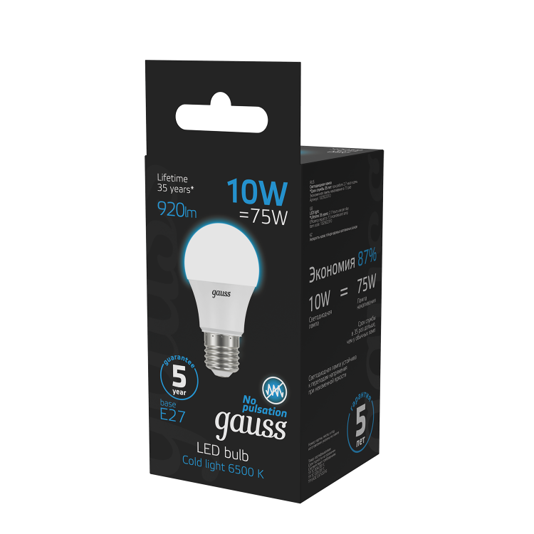 Лампа Gauss A60 поможет экономить ресурсы ничем не жертвуя. Благодаря использованию передовых технологий, эта энергоэффективная лампочка позволяет вам наслаждаться ярким, равномерно естественным и мягким светом, ничем не уступая традиционным источникам. Световой поток 920 люмен и низкое энергопотребление делают эту лампу идеальным выбором для длительного использования. Холодное освещение 6500К подойдет для рабочей обстановки как в офисе, так и для кухни или мастерской дома.