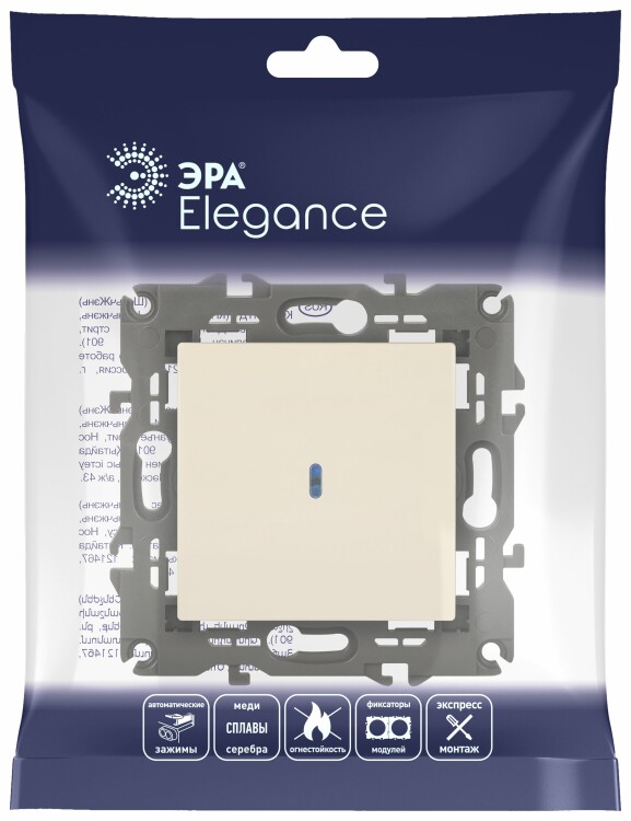 Выключатель 1-клавишный подсветка Эра Elegance слоновая кость 14-1102-02. Оснащён автоматическими клеммами для надёжной фиксации жил кабеля в механизме. Рамки приобретаются отдельно.