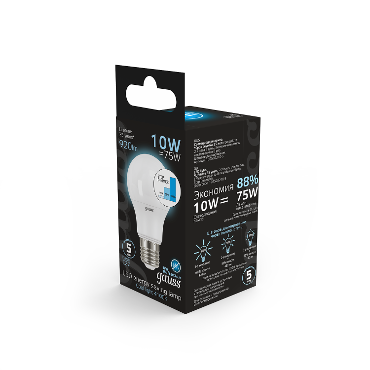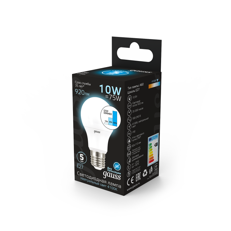 Лампа Gauss A60 поддерживает светорегулирующие устройства. Спокойный дневной свет 4100K в максимальном режиме подойдет для большинства рядовых ситуаций на работе и в быту. Когда это требуется, можно понизить яркость лампы переключением на половину мощности. Если вы не читаете и не работаете, просто хотите расслабиться без избыточного для вас в данный момент освещения, можно снизить яркость до 15%.
