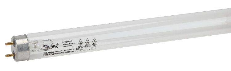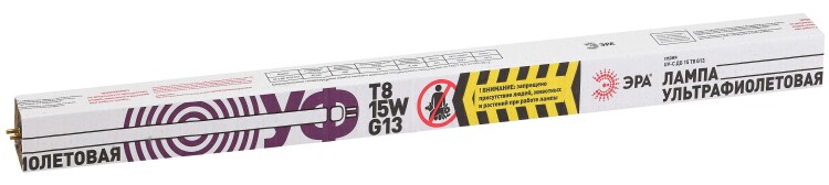 Люминесцентная ультрафиолетовая лампа для обеззараживания помещений (ЛЛ УФ), рабочая длинна волны 253.7nm 15 Вт., цоколь G13,тип колбы Т8, 12000 часов. Бактерицидные ультрафиолетовые лампы для пищевой промышленности в ассортименте ЭРА - это удлинённые лампы формата Т8. Лампы УФ-бактерицидные ЭРА представлены в двух вариантах мощности - 15 и 30 Вт.