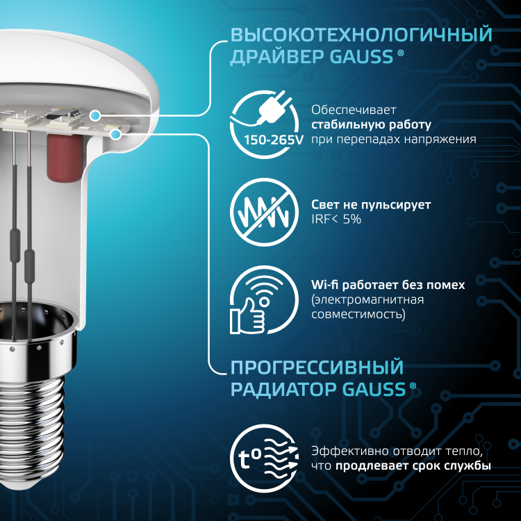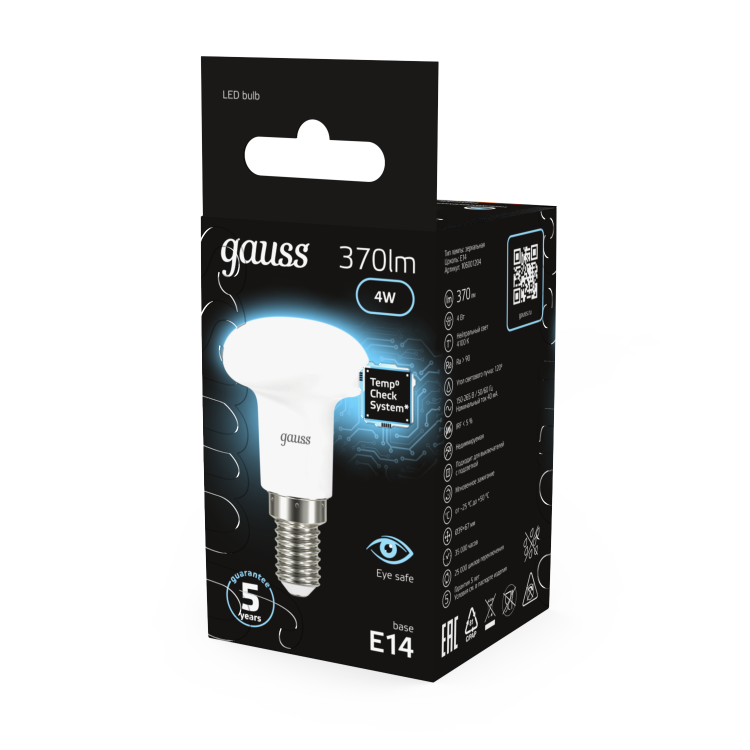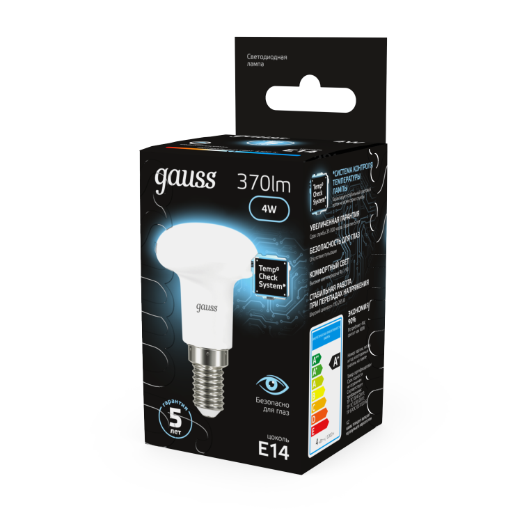 Отличная замена ламп накаливания и компактных люминесцентных ламп форм R39, R50, R63. Благодаря направленному световому пучку эти лампы помогают создать красивое, акцентное освещение. Спектр применения зеркальных ламп Gauss Black весьма широк: они прекрасно подойдут для любых типов потолков, для светильников направленного света и точечной подсветки.