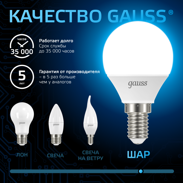 Светодиодные лампы Gauss Black в форме шара подойдут для большинства светильников, так как в категории присутствуют два вида цоколя. Светодиодные лампы Gauss Black активно используются для освещения жилых и офисных помещений. Лампы излучают приятный свет, который комфортен для глаз, без эффекта пульсации. Матовая колба ламп равномерно рассеивает свет и подходит для открытых светильников и прозрачных плафонов. Все лампы Gauss при колебаниях напряжения лампы не теряют яркость и не мерцают.