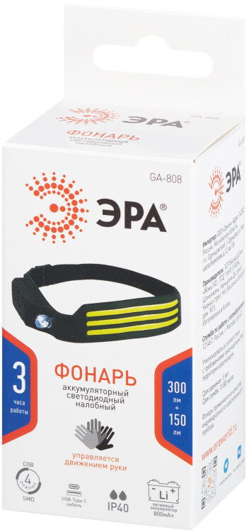 Фонарь налобный светодиодный ЭРА GA-808 Кибер-3 аккумуляторный 5 Вт COB + 3 Вт LED сенсорное управление 5 режимов