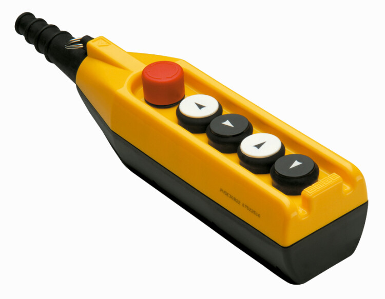 Пульты управления EMAS серии PV предназначены для управления кранами, кран-балками, тельферами, цепными и канатными талями, мостовыми и козловыми кранами. Также пульт серии PV может иметь несколько вариантов исполнения: двух, трех, четырех, пяти, шести, семи, восьми, девяти, десяти, одиннадцати и двенадцати кнопочные, и включать аварийный останов, аварийный сигнал, сигнал, ключ марка, кнопка (переключатель) вкл / выкл питания, световым фильтром, клавишами увеличения или уменьшения скорости работы двигателя, двух или четырех позиционными джойстиками. Пульты управления EMAS изготовлены из высококачественного пластика армированного стекловолокном,