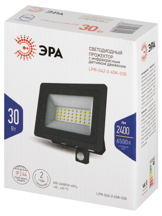 LED-прожектор серии ЭРА LPR-042-2 с регулируемым инфракрасным датчиком движения. Настраивать можно следующие параметры: временной интервал освещения (от 5 секунд до 8 минут), чувствительность к движению (расстояние 1 — 8 метров), чувствительность ко времени суток (световой поток 5 — 2000 лк). Датчик имеет поворотную конструкцию.