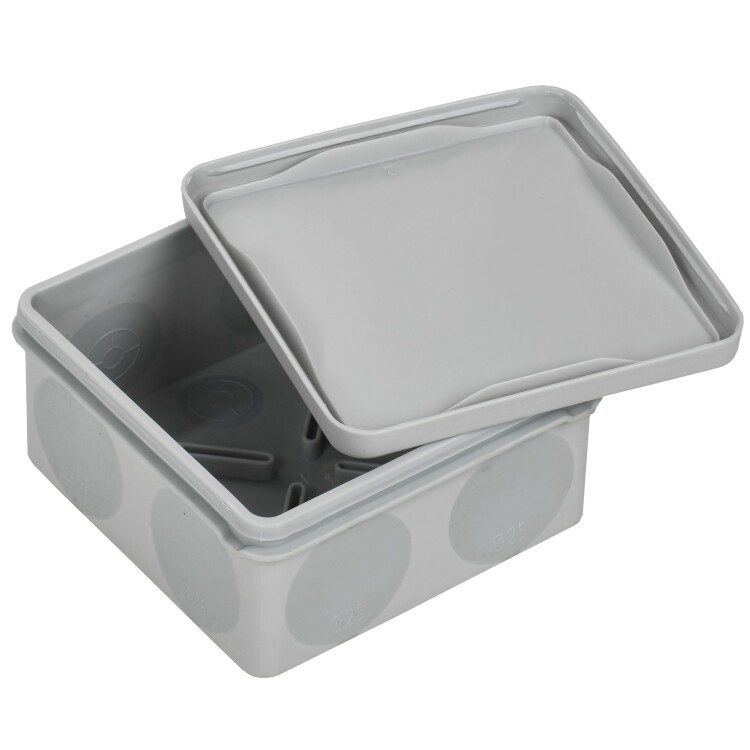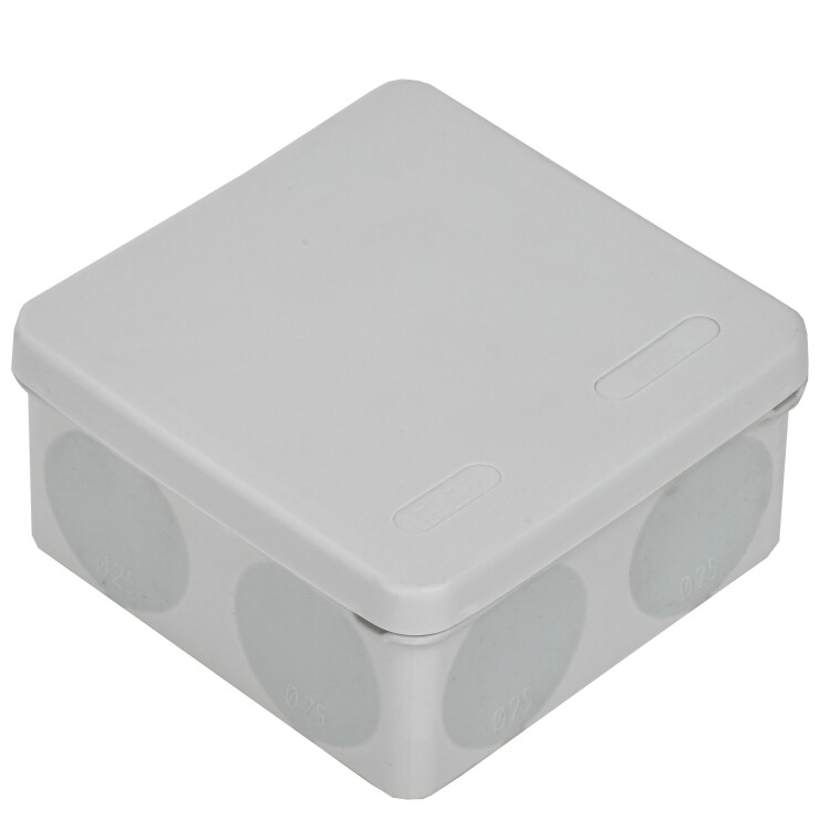 Монтажные коробки для открытого монтажа предназначены для разветвления проводов и кабелей, также для скрытия и дополнительной защиты мест коммутации. Используются как часть системы электрической канализации, состоящей из жестких и гофрированных труб. Коробки производятся из материалов, которые не содержат галогенов. Коробки обладают повышенной степенью защиты IP67 и устойчивостью к ультрафиолетовому (УФ) излучению и могут быть использованы на открытом воздухе, а также во влажных и пыльных помещениях. Подходят для прямого монтажа. Материал изготовления: полипропилен. Материал коробок является безгалогенным («HF» — halogen-free). Цвет: серый. Степень защиты: IP67. Количество вводов: 8. Размер: 100х100х50мм.