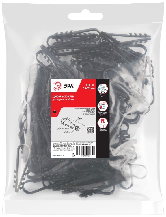 ЭРА Дюбель хомут NO-224-227 для круглого кабеля 19-25 мм чёрный (100 штук)
