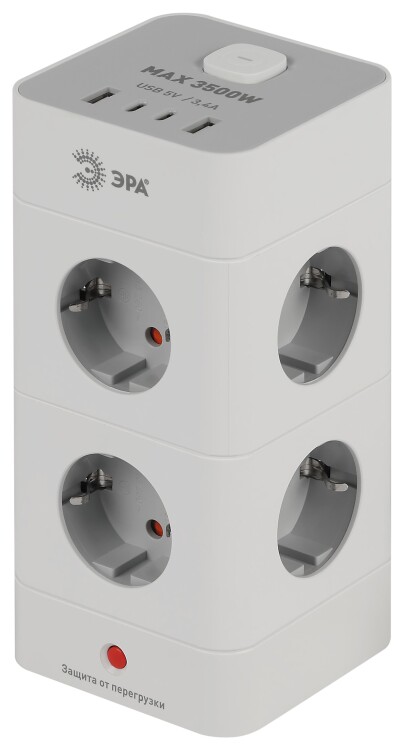 Сетевой фильтр Эра TWR-8es-1,5m-4USB-W рассчитан на одновременное подключение большого количества техники. На корпусе расположены 8 розеток с заземлением. Прочный корпус в виде башни из негорючего поликарбоната. Блок защиты подключаемых устройств включает термореле для защиты от короткого замыкания и перегрузки. При нагреве из-за превышения нагрузки термореле срабатывает и обесточивает все подключенные устройства. Трехжильный провод ПВС обеспечивает допустимую максимальную нагрузку до 3680 Вт. Правильно подбирайте бытовые приборы, чтобы не превышать общую нагрузку на сетевой фильтр. 4xUSBA+C 3,4A 5В~ 18Вт. Длина провода модели составляет 1,5 метра. Удлинитель удобно использовать в пределах одной комнаты.