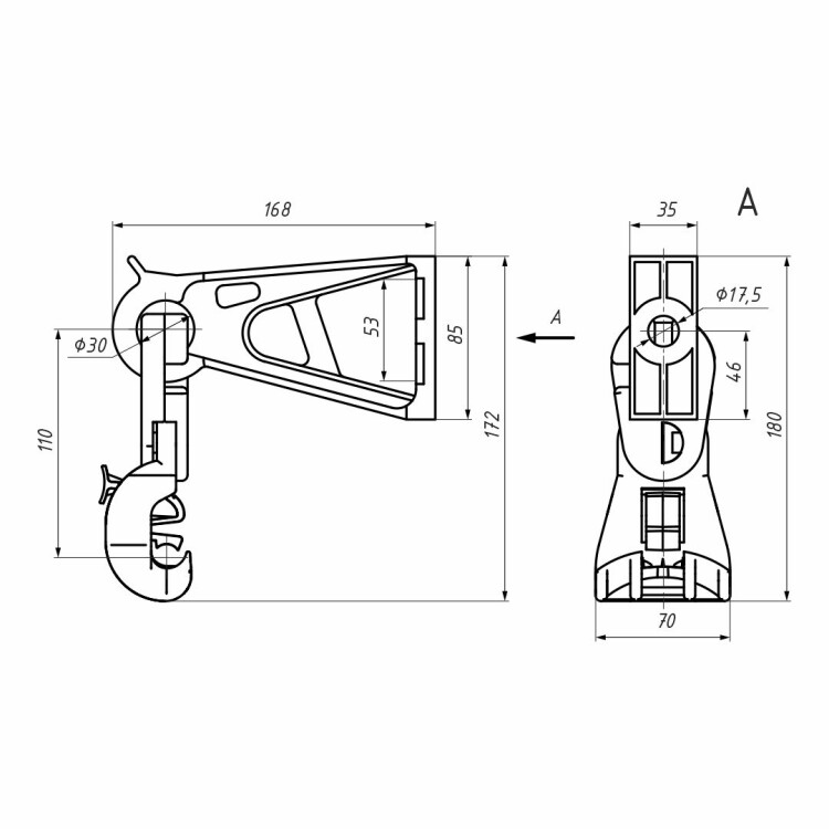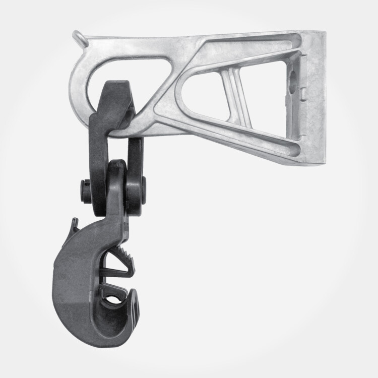 Используется для подвески провода СИП-2 на промежуточных и угловых опорах ВЛИ при углах поворота трассы ВЛ до 30°. Обеспечивает надежную фиксацию кабеля на определенной высоте и предотвращает его провисание между опорами. Комплект состоит из анкерного кронштейна и поддерживающего зажима. Крепится на опорах с помощью металлической ленты F 20.7 и двумя скрепами C 20 при помощи инструмента для натяжки ленты OPV. Нейтраль фиксируется защелкой в зажиме, подвижное соединение позволяет зажиму двигаться в продольном и поперечном направлениях. Зажим имеет звено ограниченной прочности для защиты магистральной линии от обрывов. При продольном перемещении СИП подвижное звено позволяет уменьшить циклические деформации несущей жилы. Элементы зажима, контактирующие с несущей нулевой жилой, изготовлены из диэлектрического материала и выполняют роль изолятора, а также защищают изоляцию жилы от механического повреждения. Обладает высокой прочностью, устойчивостью к ультрафиолету, коррозии, воздействию экстремальных температур, влажности и другим погодно-климатическим факторам.