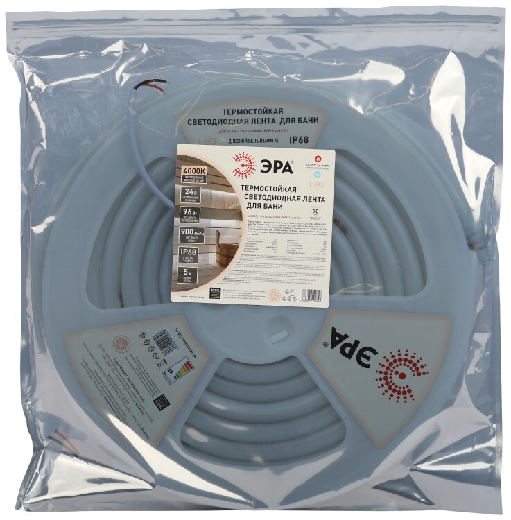 Термостойкая светодиодная лента LS2835-9,6-120-24-4000K-IP68-3 year-5m со степенью защиты от пыли и влаги IP68 – современный способ создания подсветки и освещения в банях и саунах. Светодиодная лента предназначена для эксплуатации при температурах от -30 С до + 100 С. Легко и быстро устанавливается на любой поверхности с помощью крепежей, которые есть в комплекте со светодиодной лентой. Светодиодная лента не требует пайки. Для подключения можно использовать коннектор Б0062253 - LS-connector-15mm-D-IP68-bath. Рабочее напряжение ленты составляет 24 В, а мощность равна 9,6 Вт/м. Светодиодная лента обладает световым потоком 900 лм/м с дневным белым цветом свечения (4000 К). Угол рассеивания 360.ВНИМАНИЕ: термостойкую светодиодную ленту с напряжением 24В допустимо подключать последовательно отрезками не более 5 м. Во избежание выхода из строя не допускается длительная работа ленты в смотанном виде.