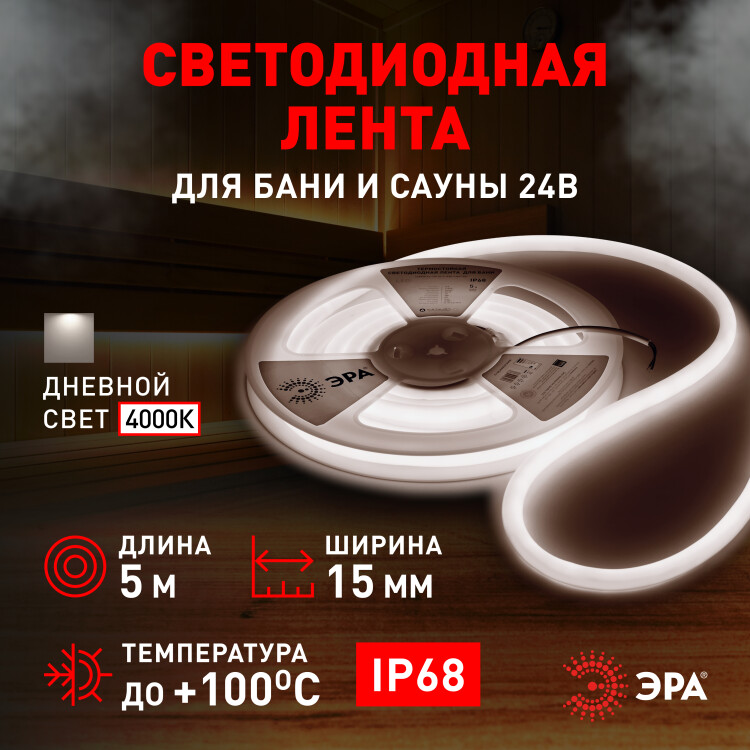 ЭРА Лента светодиодная термостойкая для бани LS2835-9,6-120-24-4000K-IP68-3 year-5m дневной белый