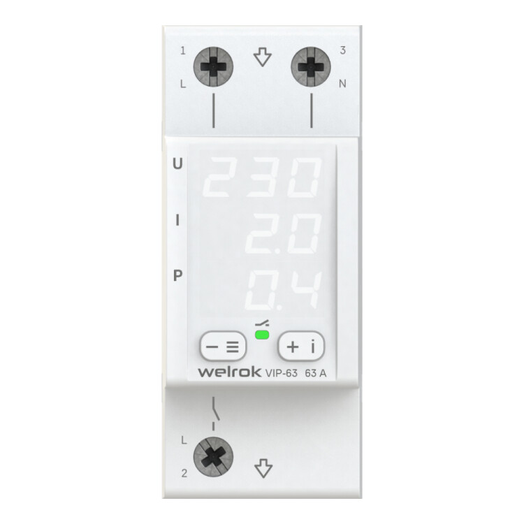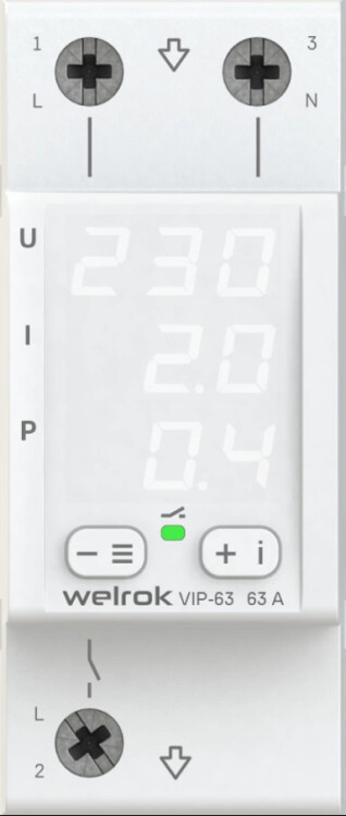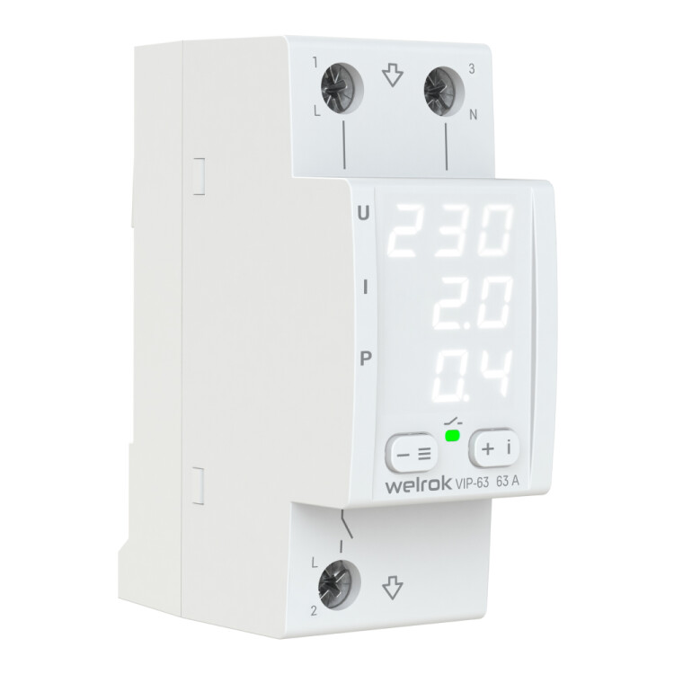 Welrok VIP-63 Реле напряжения с контролем тока 63 А (max 80 A), 13 900 ВА